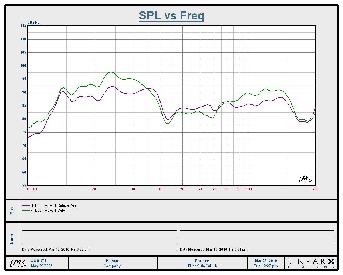 Green: all 4 subs; Purple: all 4 subs + Audyssey