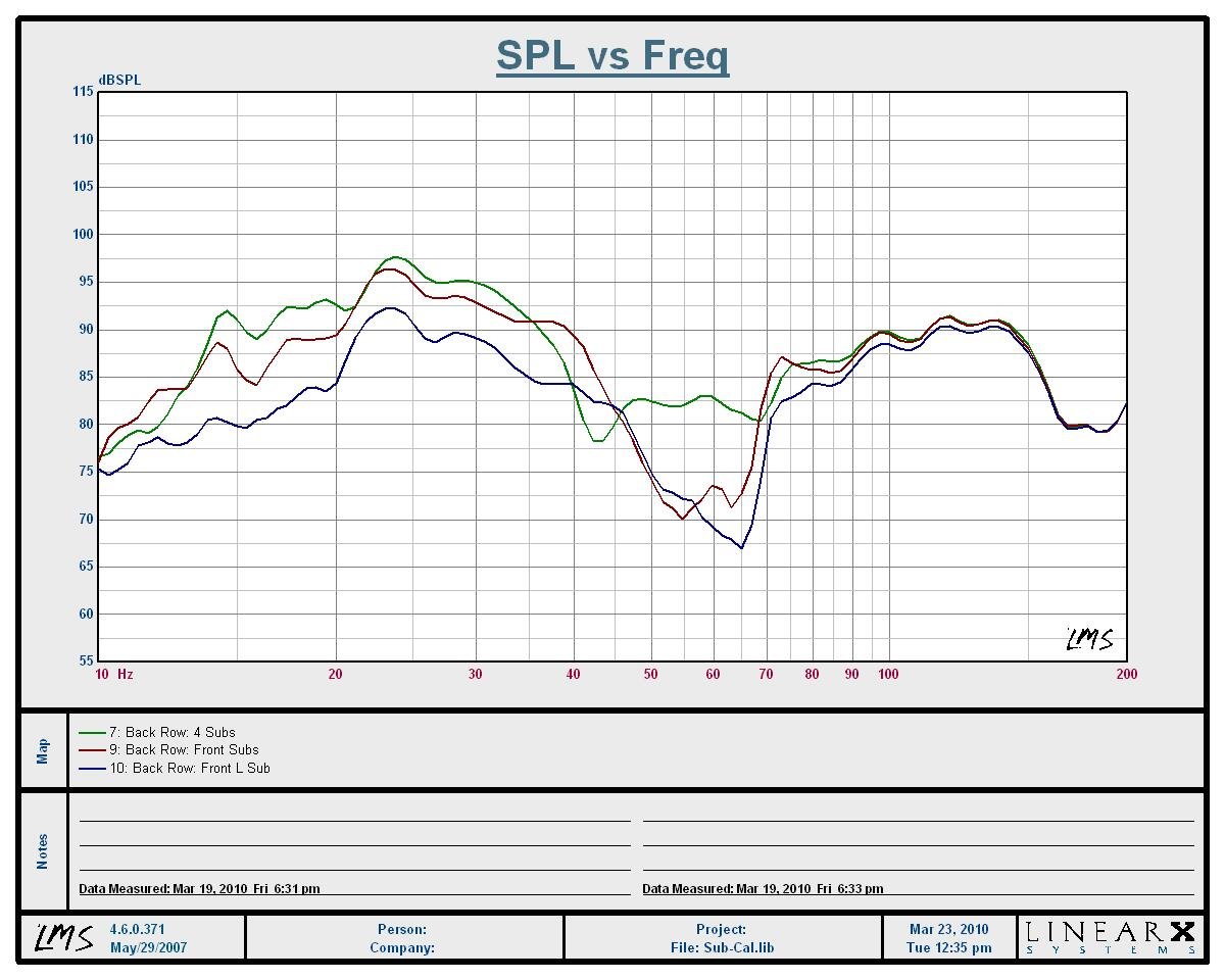 Once you've achieved the best measurable response at the primary listening position, repeat this procedure for the next best seat or secondary listening position. Try to find a combination of settings that yield the best response for both locations. You can expand this for more seats but in my experience if you've done a good job for the two main seats (ie. front center row and back center row) the other seats will usually benefit as well. Again the better you properly position your subs, the less guess work and tweaking you will have to do to attain consistent and optimal frequency response for all listening seats.
