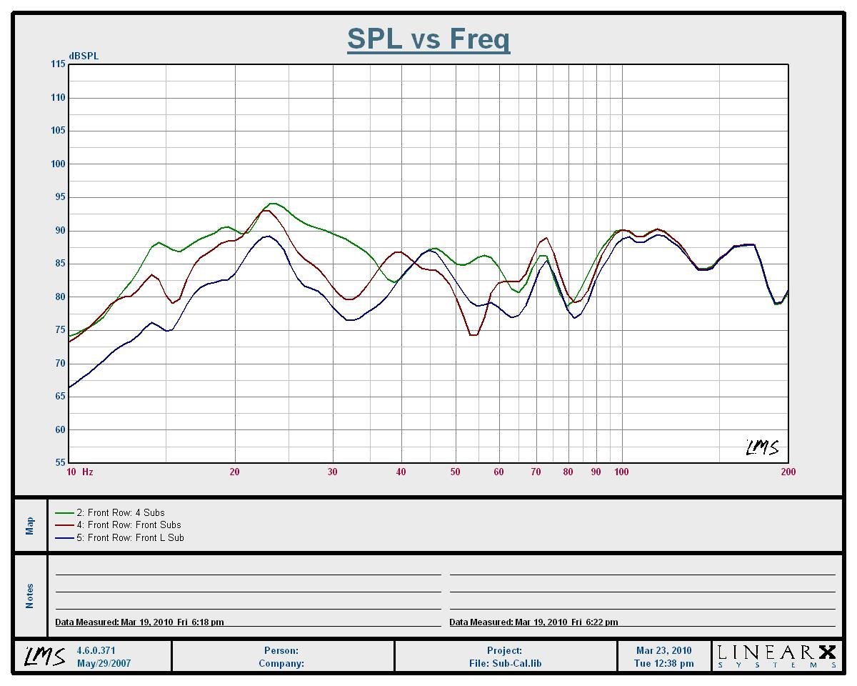 Green: all 4 subs; Red: front subs, Blue: Front Left sub