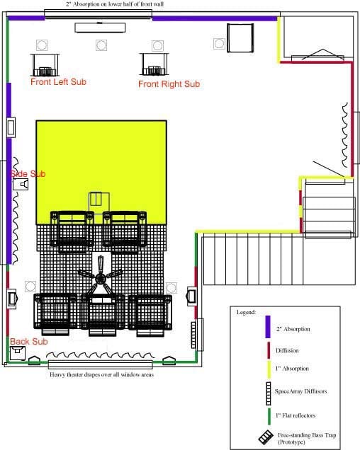 If the subs are properly setup, very few or no low frequency passive room treatments will be required as they tend to be cost prohibitive and space intensive. But, they can be a useful tool in helping to improve bass response, though they go beyond the scope of this article. You can read many articles on bass traps in our Acoustics section of the website.