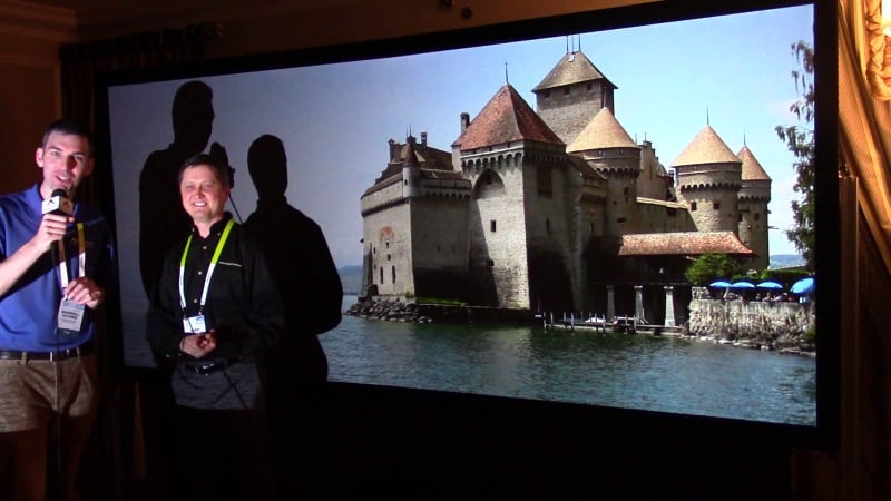 The Ambient-Visionaire Black is a 1.2 gain material with a deep background that absorbs 90% of ambient light from any direction. Paired with the light absorbing carbon particles are stacked and dithered non-mirrors. This construction rejects off-axis ambient lighting, improves contrast ratios in lit environments, and still boasts a wide viewing angle. Our video clearly shows what we saw at the show; this approach works fantastically and allows you to install a HUGE screen (132" at CES) in a lit space and still get a great picture. It doesn't hurt that, while not the least expensive projection screen on the market, Seymour AV offers a lot of bang for the buck with advanced screen materials, a number of frame options, and options like masking panels to get exactly the screen you want at a variety of price points.