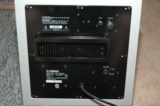 ysubThe subwoofer included with this system is the Advanced Yamaha Active Servo Technology YST-SW030.  This subwoofer has 130 watts of dynamic power.  The unit is silver like the rest of the speakers, and contains a bottom firing 8” cone woofer, with side porting.  The subwoofer included a 5-meter subwoofer cable.  The back of the unit was very simple and contained only a power on/off button, a volume knob and a power indicator light.
