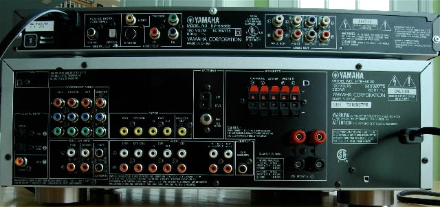 YfrontThe carton contained a total of 5 boxes, including the HTR-6030 receiver, the DV-S5860 DVD player, the NS-AP8600 speaker system, the speaker stands, and the YST-SW030 subwoofer.  The only assembly required was attaching 4 of the AP8600 speakers to their speaker stands (the center channel speaker has no stand).  Yamaha also includes some very small gauge speaker wire and both the receiver and DVD player come with very basic cables.  One issue I had with the system is that they did not provide you with any digital audio cables (coaxial or optical).  I understand that this is an entry-level system and priced very competitively, but if you give the average person the same old red, white, yellow connectors they have always seen, they are likely to assume that is what they should use.  Then in a couple of months when they just cannot figure out why their system doesn’t seem to be performing up to par, they’ll call that neighborhood guru (and after having groveled an appropriate amount) who will come over and discover they are not hearing any of the great digital features the system is capable of just because they didn’t use the appropriate connectors.
