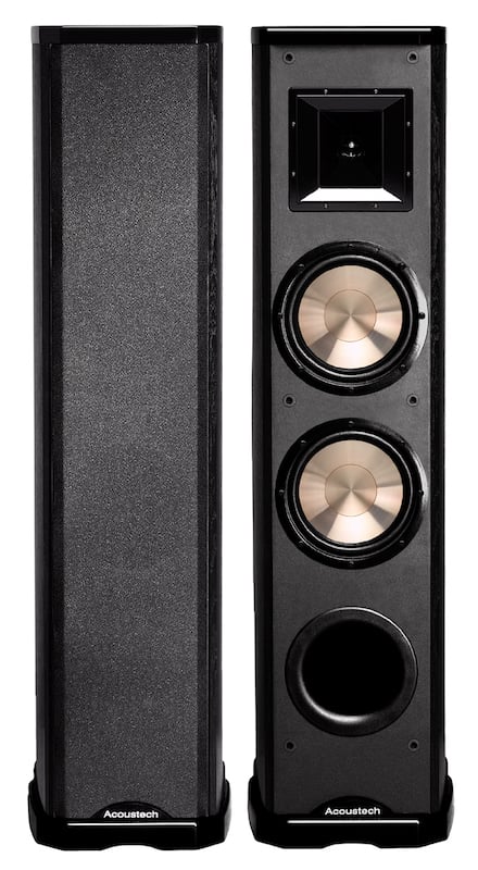 These speakers are part of Premier Acoustic’s Titanium Series that include bookshelf speakers, center speakers, subwoofers, and the tower speakers featured here. These three-way speakers are 40.5”H x 10.35”W x 12.5”D with dual 8” drivers, one 5” mylar midrange, and a 1” titanium dome tweeter. They have a frequency response of 35Hz-20kHz, 92dB sensitivity, 8ohm impedance, 175w power handling, and weigh 50lbs each. They are available in Cherry or Black piano high gloss. Both finishes come with Premier Acoustics signature piano gloss lacquer on the top and bottom panels. With the two 8” drivers these speakers should be very capable of producing low bass without much distortion at reasonable listening levels. They are one of the three widest speakers in this round up. They would do well in a room that has some space, but obviously would easily fill a small room as well. These speakers come with a five-year warranty but it is not specified if it is transferable.