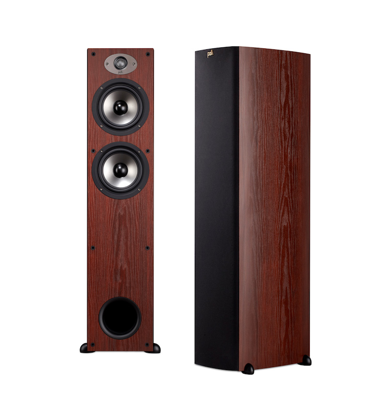 Another speaker discussed in this round-up is the Polk Audio TSx 330t. This two-way speaker come with a 1” Dynamic Balance silk/polymer dome tweeter, dual 6.5” Dynamic Balance bi-laminate drivers, a 3” front port, and dual five-way binding posts. These speakers are 37-7/16”H x 11.25”W x 13-3/8”D, have a frequency response of 33Hz-25kHz, 90dB sensitivity, 8ohm impedance, 150w maximum, and weigh 29.9lbs each. They also come with a five-year parts and labor warranty. It is claimed that all Polk speakers are timbre-matched within their series, designed with the same components throughout, to achieve seamless speaker-to-speaker blending effects in multi-channel systems. This should be true for every speaker brand. According to Polk, their curved enclosure design creates a rigid, acoustically inert space, with non-parallel curved side panels that reduce audible coloration.