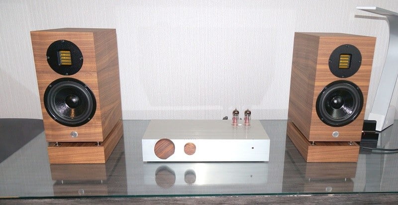 present themselves to the US market. Fyne Audio was formed out of the team who were behind the Scotland-based Tannoy loudspeakers before Tannoy was bought out by a larger conglomerate and their engineering and design work was outsourced to China. That left a whole group of Scottish loudspeaker makers with nothing to do, so they started a new business for themselves using all the experience that they had accumulated under Tannoy and now free to explore new designs since they were unchained from traditional Tannoy design considerations. Fyne Audio has yet to find a US distributor, but they have a range of products to offer, from highly affordable bookshelf speakers to high-priced, high-end tower speakers. The speakers that caught my attention at Fyne’s AXPONA exhibit were the F500 bookshelf speakers. The F500s are coaxial speakers that use a titanium compression tweeter mounted in the center of a 6” woofer. They had a nice black oak finish and used a unique flared port on the bottom of the cabinet. I had the Fyne Audio reps play some music and found the sound to be balanced, lively, and full, especially for such modestly-sized speakers. Converted from the pound sterling, the dollar cost of the F500 would be an affordable $780 per pair. I hope that this speaker brand finds a US distributor soon because I think speakers this good at such an accessible cost would find a very receptive market in North America.