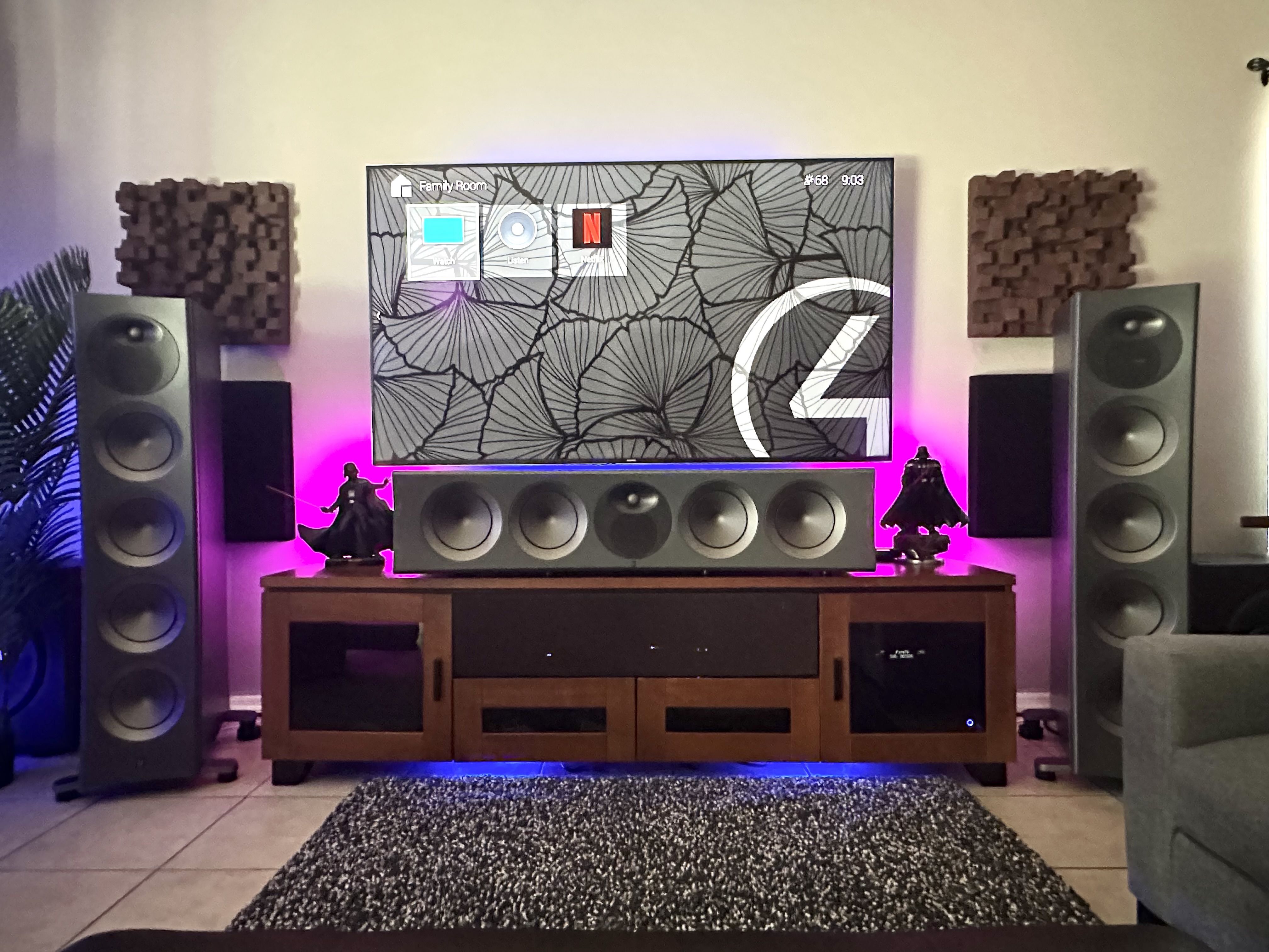 In this rooms setup, the Yamaha CX-A5200 served as the AV preamp, with RBH Sound UNRIVALED Alpha amplification (300 watts per channel into 8 ohms and 600 watts per channel into 4 ohms) powering the Towers, Center, and back base layer surrounds. The height (Atmos) channels were powered by the Fiera4 amplifier, which provided clean, reliable power to maintain dynamic and cohesive performance for immersive surround sound. Source devices included an Oppo BDP-103 for Blu-ray playback and an Apple TV 4K for streaming Spatial Audio. Control4 was used for system control.
