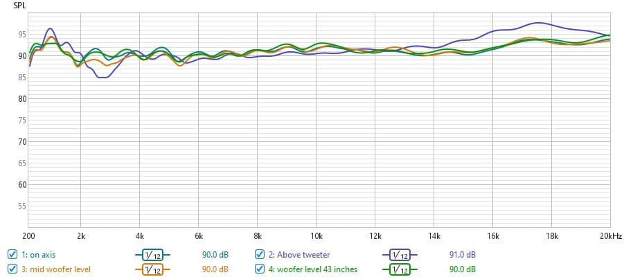 Along with the horizontal off-axis, the vertical off-axis is also very important. This is when I move the mic up and down the speaker’s vertical plane. This shows once again, textbook or better than textbook responses aside from if you were seated above the loudspeaker’s height (2: Above tweeter) - which would never happen unless you were a tall gentleman that exclusively listens standing up.