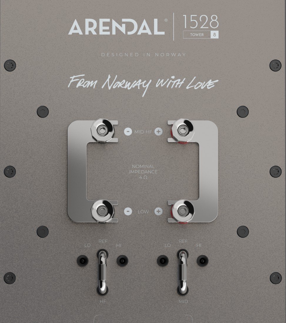 Arendal says that the anodized terminal plate is designed to be both beautiful and durable, and to provide both performance and flexibility for the user. The custom rhodium-plated-copper bi-wire binding posts promise superior conductivity and durability for high-quality audio signals, accommodating single wiring, bi-wiring, or bi-amping. High-quality rhodium-plated-copper jumpers are included, eliminating the need for what Arendal describes as the “inferior steel connections” seen in some other speakers. The use of superior materials preserves signal integrity and sound clarity, according to the company. On the back of the 1528 Tower 8, Monitor 8, and Bookshelf 8, you’ll also find Level Adjustment jumpers, which are designed to simplify achieving the perfect sound balance in your room. New for the 1528 Series, this feature allows the user to adjust the tweeter and/or midrange sections individually by 2dB, either boosting or attenuating the sound to achieve the desired tonal balance. This flexibility facilitates the accommodation of various room acoustics and personal preferences, simply by moving the jumper from the REF (Reference) position to either the LO (Low) or HI (High) setting.