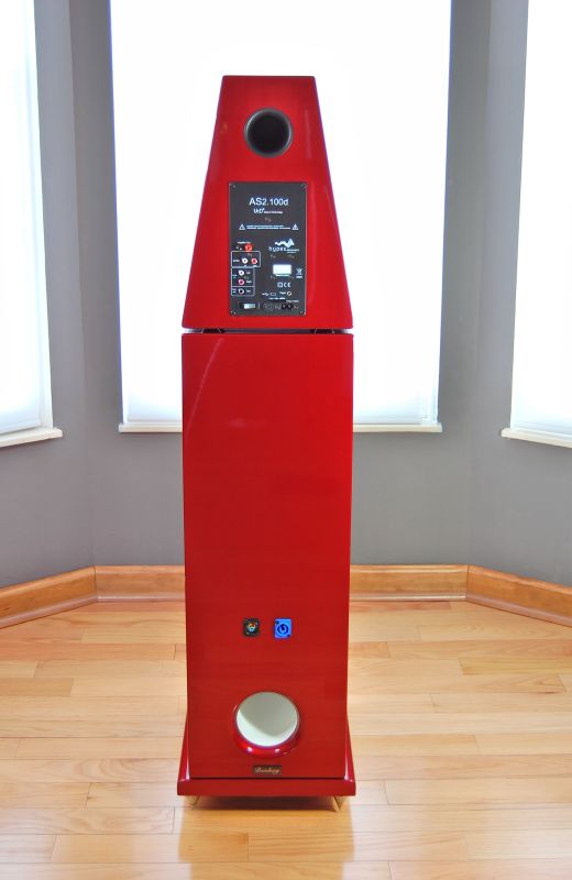 Starting from the top, the monitor is a standalone speaker in its own right. The 22mm [7/8”] soft-dome tweeter and overbuilt 15cm [6”] midwoofer are mounted in a vented cabinet with low end output that extends down to 40Hz. This monitor is self-powered by a two-channel DSP plate amplifier rated for 100W/channel located on the back panel along with the dual-flared port. On the monitor’s bottom are four hemispherical vibration-isolating rubber feet. These soft feet provide high traction for the credenza or speaker stands, as well as isolate vibrations from the bass cabinet which could smear the acoustic image.