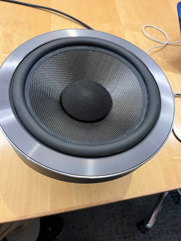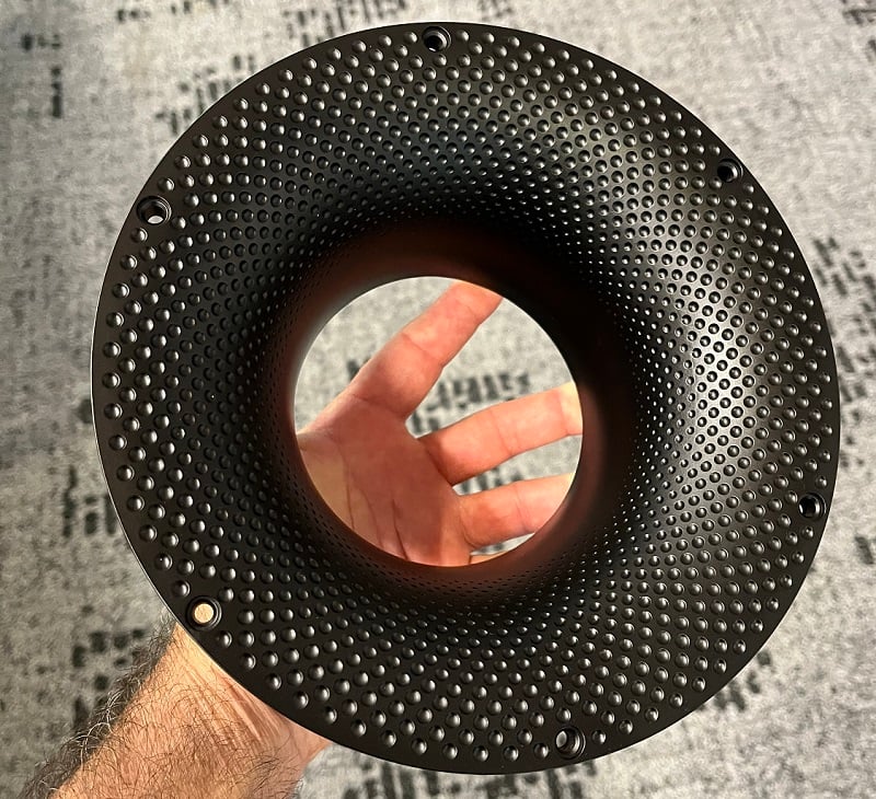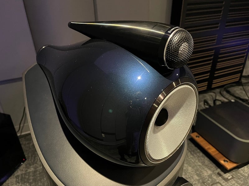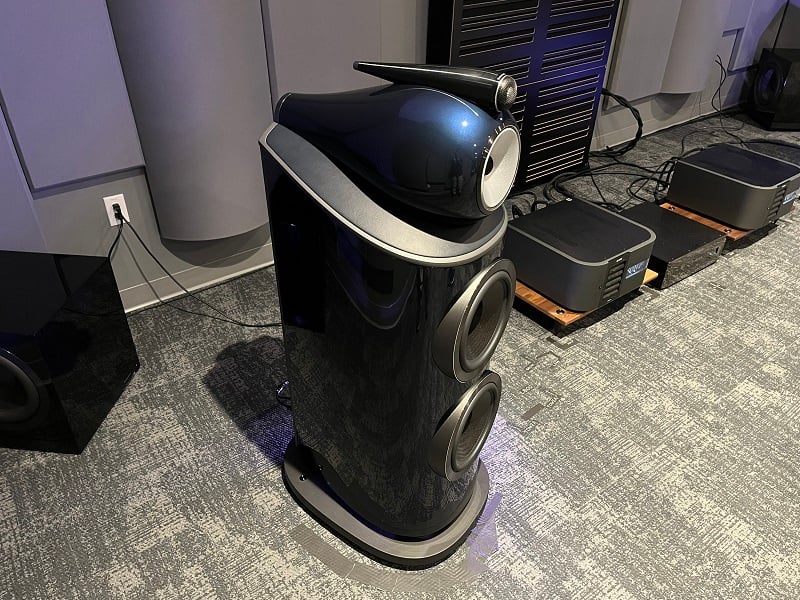 We got a chance to see the newly enhanced aluminum top plate beneath its Turbine Head midrange enclosure. This new design uses a new optimized skeletal structure and carefully placed damping material. Bowers & Wilkins says these advancements “Greatly reduce unwanted resonance from the top of the enclosure.”
