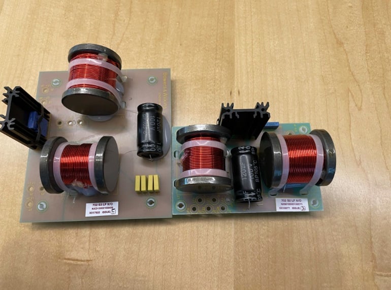 Last, but not least, in the driver complement, the bass drivers have the same cones as the prior generation but upgraded motor and suspension assemblies. While the cones are not new, they use the Aerofoil technology from the 800 Series with varying thickness across the driver. Very similar to the cones in the 800 Series but with less expensive materials. The new S3 series features improved crossover assemblies, with improved heatsinks as compared to the S2 series to take advantage of these refinements.