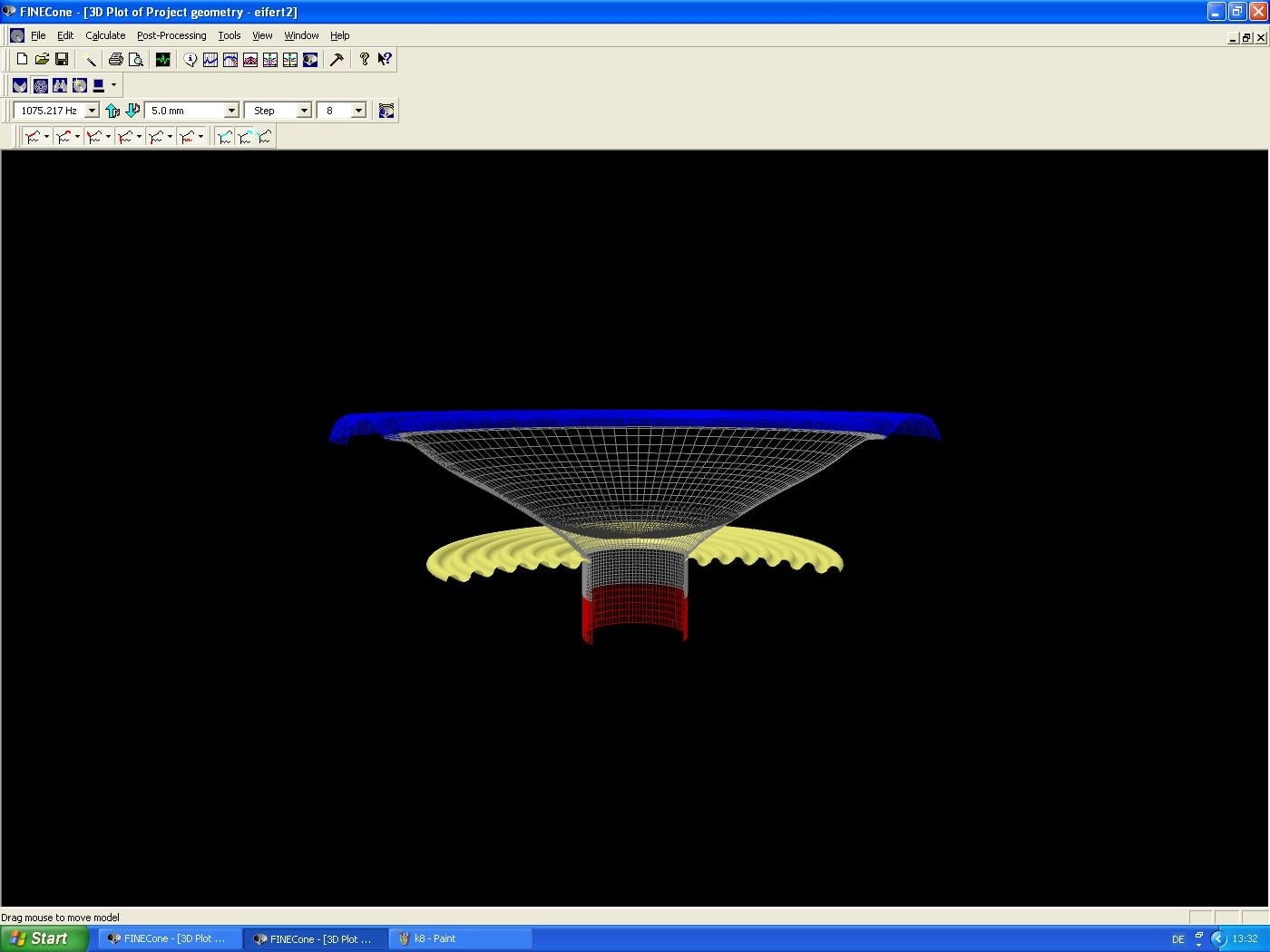 The picture below shows the cone of the R2 midrange driver with a theoretical displacement of 5mm at around 1kHz . Of course it is impossible to produce a displacement of 5mm at 1kHz with a real driver, but it shows impressive the behavior of the cone.