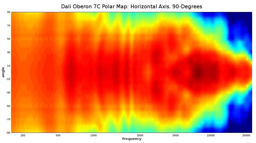 The OBERON 7C speakers hold a fairly consistent dispersion pattern up to 7kHz where the treble dispersion starts to narrow. There is some mild waist-banding centered around 2kHz, but it isn’t severe enough to have a big impact on the sound. The treble beaming doesn’t become very narrow until well above 10kHz where it doesn’t matter very much. If you want to get hit with the full range of treble, it's best to be listening at or close to the on-axis angle. It should be remembered that there isn’t much content above 12-15kHz, and many people, especially older men, no longer hear frequencies that high anyway. Curiously, DALI recommends positioning the speakers to face straight ahead so that they are angled in a parallel direction. That would put the listener in a 20 to 30-degree angle from the on-axis direction where upper treble does see a roll-off. However, the most accurate response occurs around the on-axis angle, and I would recommend listening within a 20-degree angle of that direction. My advice is to have the speakers face the listener directly.