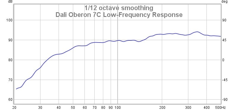 The DALI OBERON 7C towers were measured in free-air at a height of 4 feet at a 2-meter distance from the microphone, with the microphone raised to a 7.5’ elevation that was level with and aimed at the tweeter center. The measurements were gated at 8-milliseconds. In this time window, some resolution is lost below 400 Hz and accuracy is completely lost below 200 Hz. Measurements have been smoothed at a 1/12 octave resolution.