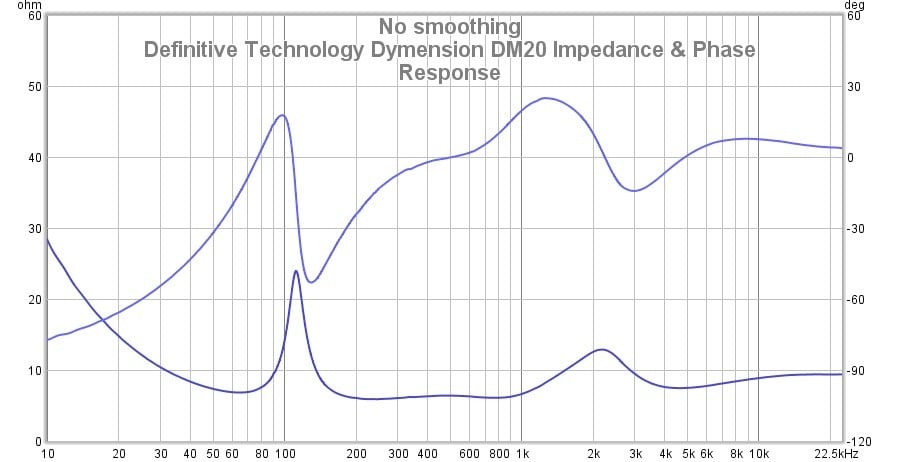 The above graph shows the electrical behavior of the DM20. This is an uneventful graph and shows a well-behaved loudspeaker in the electrical domain. Any competently designed amplifier could handle this electrical load without problem. The most strenuous part is the steep phase angle between 150 to 200Hz, but then it levels out to an easier load.