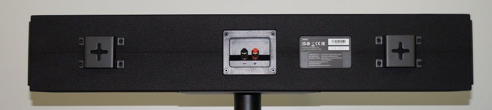 The DM20 has rear keyhole slots so that it can be mounted against the wall either horizontally or vertically. This enables it to be used as an on-wall speaker as much as a stand-mount center speaker. It is a bit hefty at 22 lbs., so make sure it is mounted onto studs or anchors. One problem is that the keyhole slots are spaced 20” apart, and this is awkward because the slots won’t quite line up with the 16” stud spacing of North American homes or 24” spacing of European homes. For this reason, I recommend that the non-stud mounting screw use an anchor, or both use anchors if the keyhole slots can’t line up with any studs.