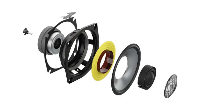 Low-Frequency information, below 200Hz, is handled by an all-new 5.25-inch aluminum cone woofer. (The UB52 bookshelf speaker has one woofer, while the UC52 center-channel speaker has two, and UF52 floor-stander has three.) The cone is made from a single piece of dish-shaped aluminum, resulting in improved stiffness. Behind the scenes are an oversized magnet, a large-diameter voice coil, and extended pole piece, which work together to deliver “improved accuracy and bass dynamics,” plus “a smoother response and greater transparency,” according to Jones and company.