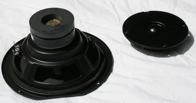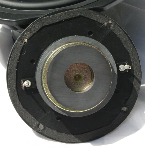 The woofers employ stamped baskets and small magnets. I was particularly surprised at how light these drivers were. The tweeter has an open back (something I haven't seen for a while) instead of a metal or plastic enclosure. Behind the drivers around the sides and back is a single piece of polyfil. The crossover contains two air core inductors, one for the high pass section and the other for the low pass section. Though they aren’t orthogonally oriented to reduce crosstalk effects, they are spaced far enough apart to minimize any audible effects. A polyester bypass capacitor is used in conjunction with two electrolytics for the HPF section of the speaker system.