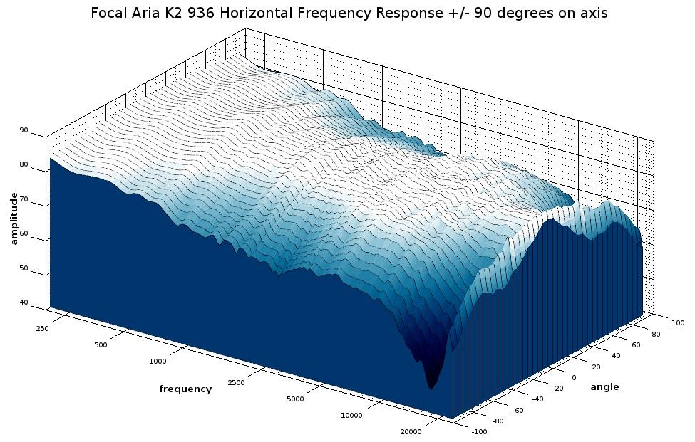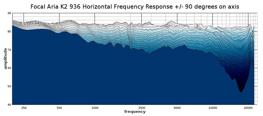 The above graphs depict the K2 936’s direct-axis and horizontal dispersion out to a 90-degree angle in five-degree increments. Information on how to interpret these graphs can be read in our loudspeaker measurement article. This is another very good showing from Focal with a terrific on-axis response and good off-axis correspondence. The response shown here stays within a 4dB window, making this a nicely neutral speaker on-axis. As we go off-axis, we do get into a slight directivity mismatch between the tweeter and the midrange where we can see the tweeter broaden the dispersion a bit above 2.5kHz, but that only starts to occur at a fairly far off-axis angle, and it isn’t a severe directivity mismatch. We do see the tweeter begin to narrow its dispersion sharply above 10kHz, as is typical of many dome tweeters, but that won’t have a very major effect on the sound since there isn’t much program material with significant content up to that band.