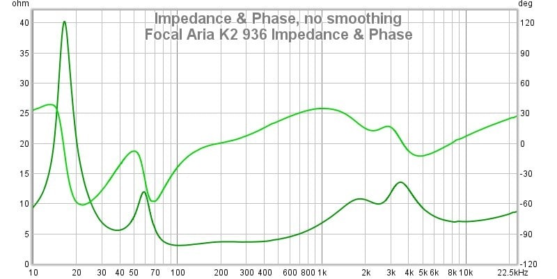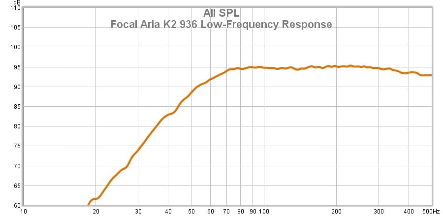 The above graph shows the electrical behavior of the Focal Aria K2 936. Focal specifies this speaker to have a nominal impedance of 8 ohms, and that seems like a stretch. This is very much a 4-ohm load; in fact, the minima drops well below 4 ohms by my measurement. I would say Focal’s spec is there as reassurance that regular AVRs can handle this load. They probably could, but with a steep phase angle at the minima at around 100Hz, a very heavily used frequency, I wouldn’t want to crank these speakers on any AVR that cheaped out on the amplifier section. These speakers should be used with a stout amplifier, but, at $6.6k per pair, they very likely will be. The dip in the low-frequency ‘saddle’ that is always seen in ported loudspeakers occurs at just under 40Hz which indicates its tuning frequency. The mismatch of the saddle ridges indicates that the resonant frequency of the bass drivers is very different from that of the enclosure, and I would guess that the higher-tuned down-firing port is behind this disparity.