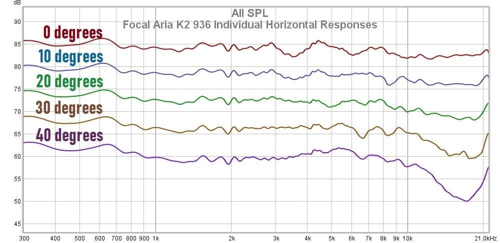 The above graph is a sampling of some of the vertical angle responses at and around the on-axis angle. Negative degrees indicate angles below the tweeter, positive angles indicate angles above the tweeter, and zero degrees is level with the tweeter. As would be expected, the height level with the tweeter produces the evenest response overall. Unfortunately, at a 44” height, the tweeter is mounted a bit high in the K2 936, and the least even response here occurs at a lower angle, ten degrees below the tweeter. Given the tweeter height, it is very possible that many people could be listening at this suboptimal angle if they have low-slung seating or are listening at a closer distance, perhaps within ten feet or so. In the product data sheet, Focal advises a 10-12’ listening distance, but that is the only mention I see of a listening distance in Focal’s literature, and that is not listed in the user manual. Something Focal might have done to alleviate this is to swap the positions of the midrange driver and tweeter. That would have brought the tweeter down to a height that more people usually listen. However, as we saw in the individual horizontal responses graph, the responses do flatten out past 10 degrees on the horizontal axis, so all of these responses likely become smoother as we move off-axis a bit. Nonetheless, this speaker benefits from a good distance between the listener or seating that elevates the listener’s ear height to the tweeter’s 44” height.