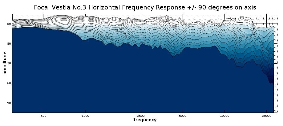While the Vestia No.3’s dispersion pattern is not perfect, it is generally quite good. There is some slight waist-banding at around 1.5kHz and 4kHz, but not enough to make any audible difference for anyone listening at any reasonable angle. Any listeners with a 50-degree angle of the on-axis response will be met with a reasonably full sound. The directivity matching between the mid-woofer and tweeter is not perfectly seamless but it is very good. We can see the tweeter start to beam above 10kHz, and, as we saw in the above graphs, its dispersion collapses above 15kHz. The Vestia No.3 has a fairly broad and even dispersion overall, so it won’t need any special acoustic circumstances to sound good. They are designed to sound good in any normal room.