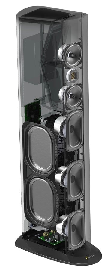 coupling to the air of horn drivers for greater efficiency. The two 5.25” upper bass/midrange drivers are also new,