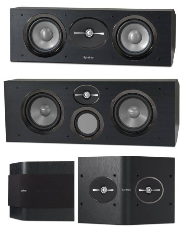 The Infinity Reference RC252 (top) and RC263 (middle) center speakers, along with the RS152 surround speaker.
