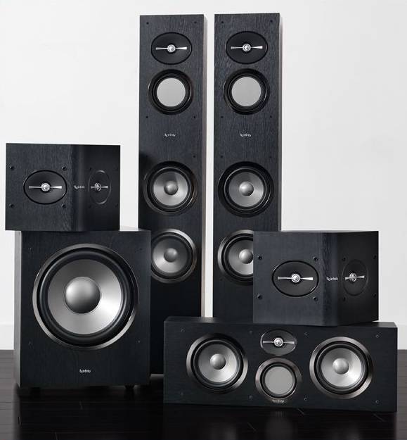 The surround speaker, the RS152, is a sealed enclosure two-way speaker design. The wide shaped cabinet has drivers on three sides, a pair of 1 inch CMMD dome tweeters on each of the forward facing angled cabinet walls and a 5 ¼ inch rear firing woofer on the back face at a specifically positioned distance from the supporting wall. Infinity refers to the configuration as Hemispherical Soundfield Technology (HST) which they say provides very even frequency response coverage over a 180 degree listening area, thus creating a speaker with flexible placement options that should have minimal effect on the speaker’s acoustic performance.