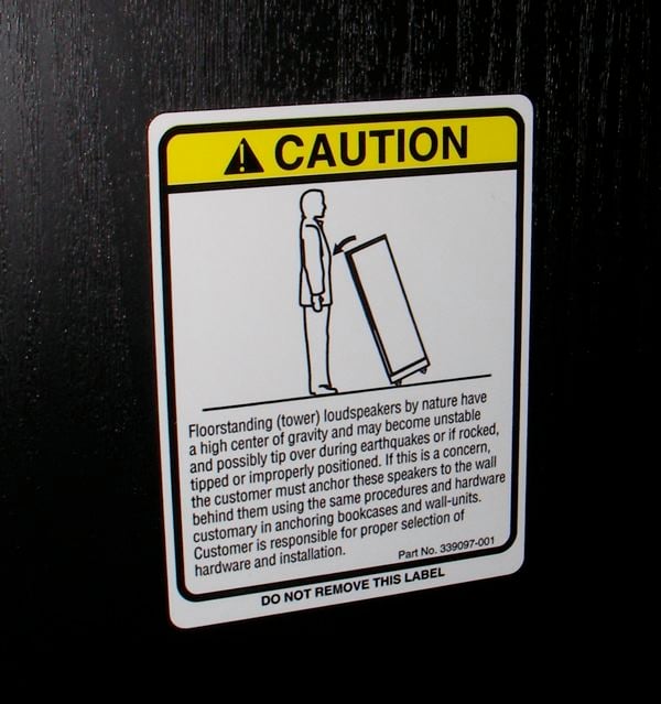 There is also a goofy sticker on the rear of each speaker - a large sticker, which has a speaker falling on a little stick man with some wordy warning about the dangers of tower speakers becoming unstable in an earthquake. To me, this deserves some ridicule. If I am spending this much cash on a pair of speakers, I don't want some lousy sticker slapped on the rear of the cabinets warning me about them falling. I don't recall a lot of earthquakes in New York - which is where JBL seems to be based...