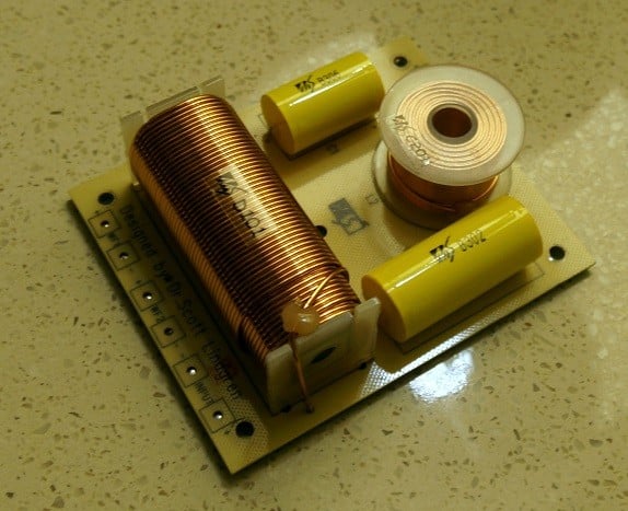 The crossover for the Cesti T speakers is a simple design. It uses second-order slopes for both the high-pass filter and low-pass filter. As such, there looks to be only a pair of inductors and a pair of capacitors on the board. The Inductors and capacitors are sizable and look to be up to the task. As stated above, the rationale for such a simple crossover is that the cones are so much alike that they will be able to blend easily, so there is no need for a complicated crossover with steep slopes.
