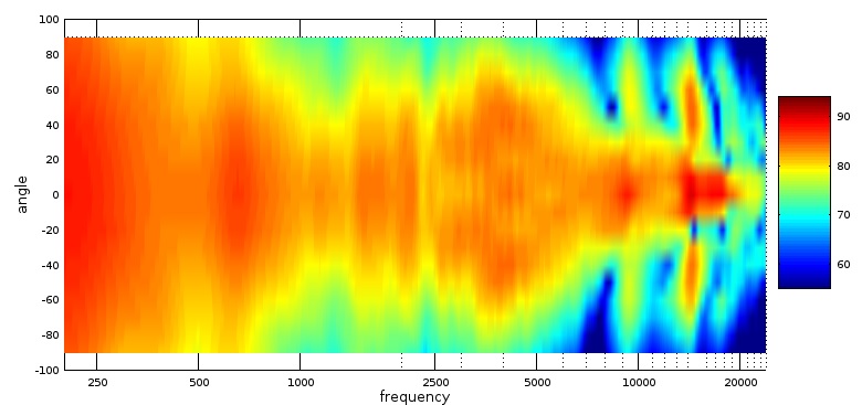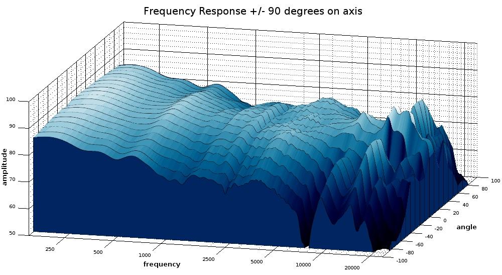 The above polar map depicts the horizontal dispersion of the Cesti T speakers, bPolar_map_rotate.jpgut in a different way then the ‘waterfall’ graphs above it. In this graph we can see some waist-banding around the mids near the crossover region, although nothing severe. The breakup modes can be seen to spread a lot of acoustic energy at off-axis angles. This would account for the sibilance heard at toed-out frequencies, even when the direct-axis brightness was reduced from the change in angle.