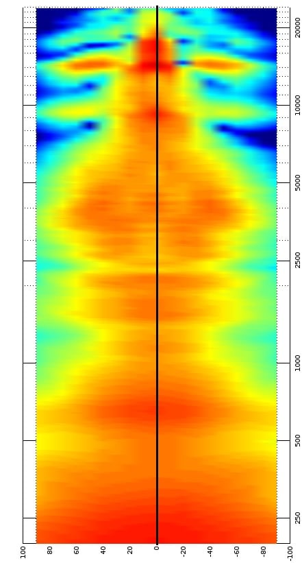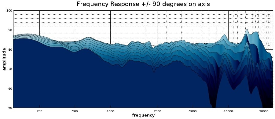 One interesting thing that can be seen when we rotate the polar map 90 degrees is the effect of the asymmetrical waveguide on both sides of its axis. I have drawn a line through the direct axis to emphasize these effects. We can see the left side of the graph projects acoustic energy more widely than the right side, and this is because the waveguide is broader on the right side of this model and expands out more from the driver. The waveguide contains the acoustic radiation in a tighter pattern on the left side. The effects become apparent above 7 kHz, and the asymmetry of the waveguide doesn’t look to be influencing the speaker’s behavior very significantly below that point.