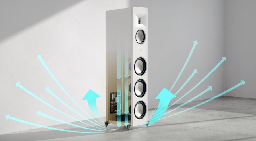 (Folded Motion Tweeters) use a folded diaphragm to compress and expand air, creating a large surface area that delivers fast, accurate, and detailed high-frequency reproduction. With Folded Motion Tweeters, you'll experience high efficiency, low distortion, and wide, yet controlled dispersion, ensuring that every note and every detail is captured in stunning clarity. Plus, the wide frequency response of our Folded Motion Tweeters means you'll hear a greater range of sound than ever before. …The Folded Motion Waveguide profile was meticulously chosen to harmoniously align the tweeters output with the dispersion of the midrange drivers, enhancing the performance of our already incredible Gen2 Folded Motion Tweeters. The Folded Motion Waveguide helps blanket the listening area with evenly distributed detail and precision, ensuring an optimal experience for everyone. The waveguide also enhances the Controlled Dispersion output of the tweeter, offering generous coverage while minimizing unwanted room reflections.