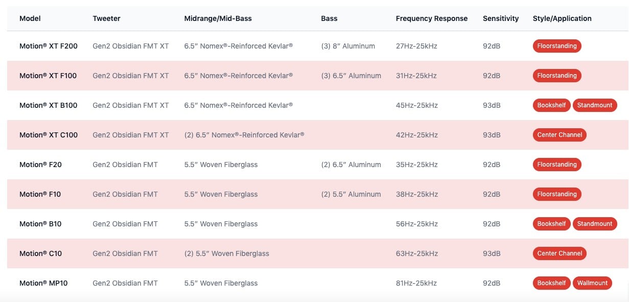 The Motion Series includes two floorstanders, one center-channel speaker, one bookshelf speaker, and a highly versatile “multi-purpose” speaker perfect for home theater surround channels and/or height channels:
