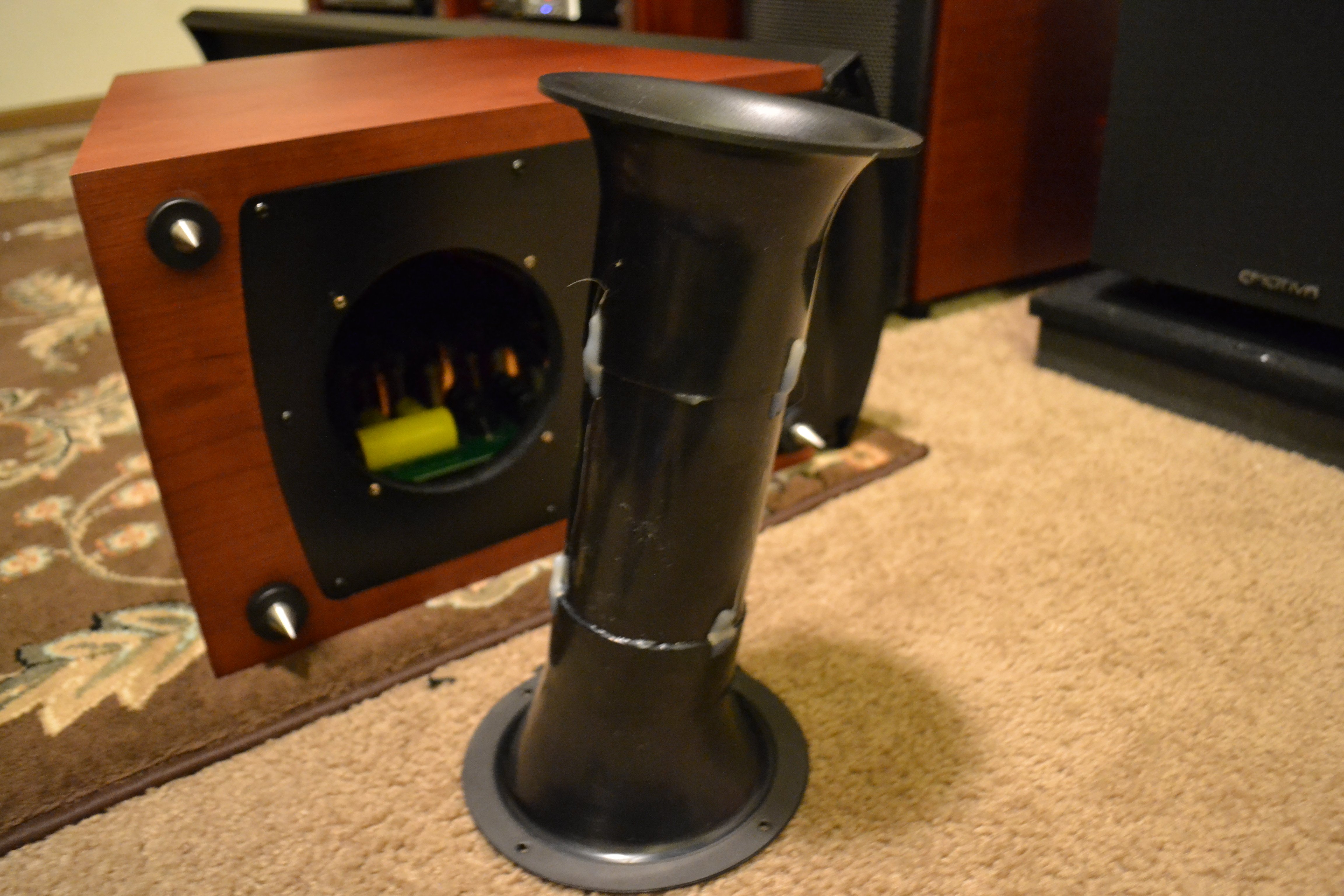 The 8” aluminum bass driver has a bumped back plate to prevent driver bottoming and is vented for heat dissipation. The cabling is twisted pair to minimize interference and wrapped in insulation to prevent them from slapping around inside the cabinet. One side of the cabinet has a piece of batting glued in place.