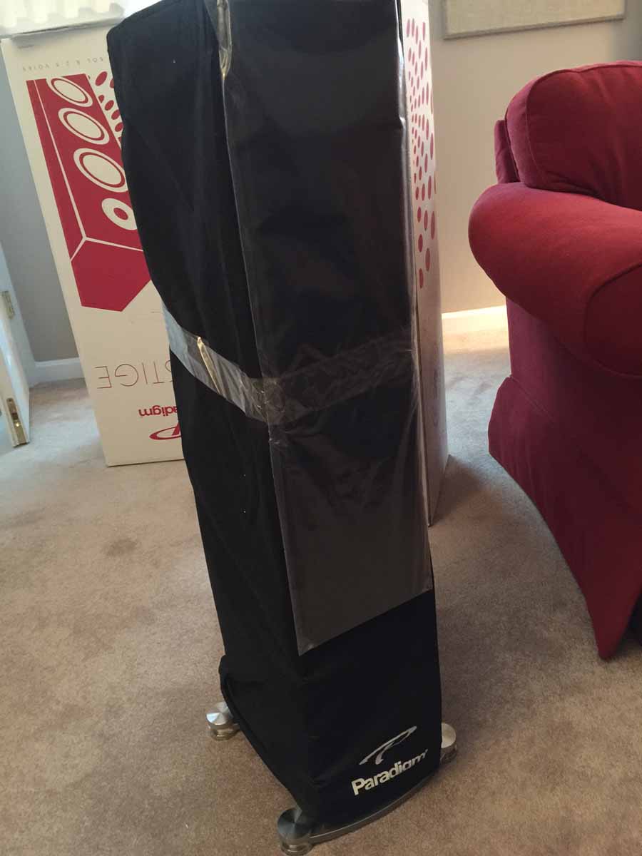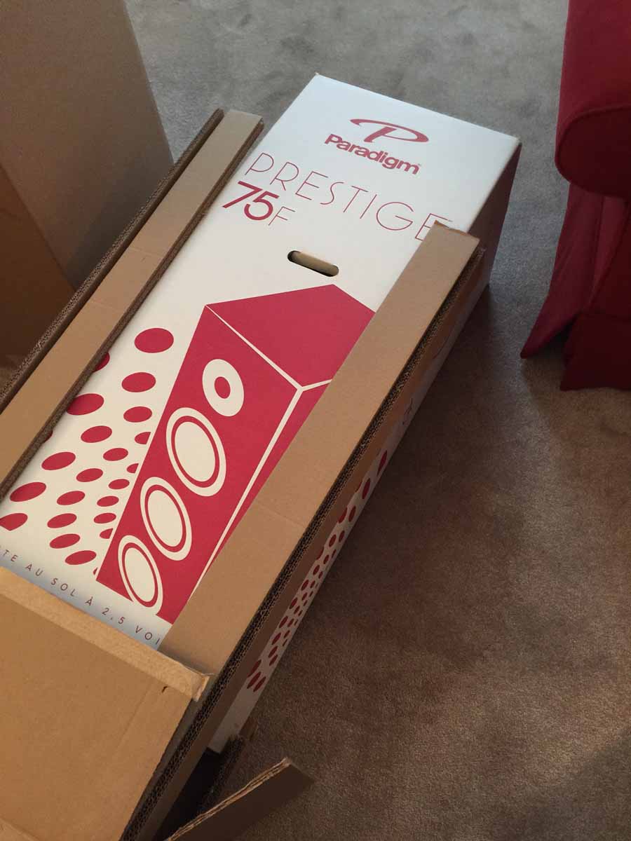 The inner cartons were the full graphic, 2-color boxes, complete with Paradigm logo, speaker drawing, model identification, etc. I would guess that in addition to protecting the speaker during transit, the outer carton also hides the identity of the box’s content, making it less attractive to thieves or unscrupulous delivery drivers. I would further guess that dealers probably discard the outer box once they receive the speakers from Paradigm and present the speakers to the retail customer in the colorful, attractive inner cartons.