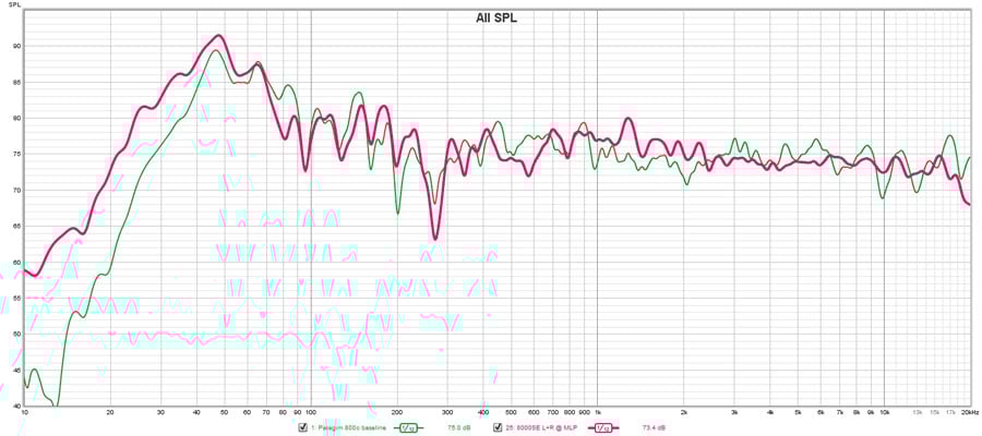 In-Room Frequency Response of Paradigm SE 8000F (red) ; Premier 800F (green)