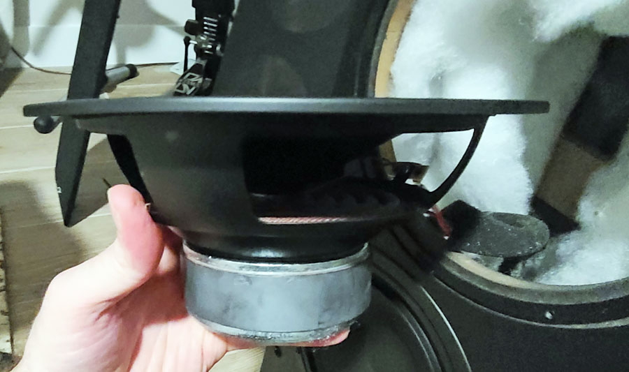 Paradigm SE 8000F Woofer w stamped basket (left) ; Front Baffle 1/2" thick (right)