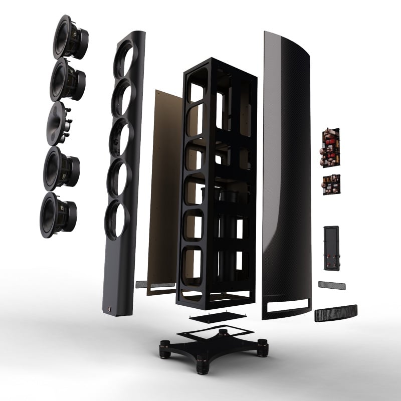The new woofer, with its increased excursion, required Perlisten’s engineers to look for ways to improve the speaker’s stability and vibration isolation. They decided to team up with the folks at IsoAcoustics to design a custom isolation/damping system only available on the S7t Limited. The speaker’s massive 40-pound machined steel base is now perched on custom isolation feet, which attenuate internal reflections and isolate from external vibrations while resisting lateral movement and oscillations to maintain correct alignment with the listening position. Perlisten says the result is “greater sound clarity and openness.” (We’ve heard for ourselves how effective IsoAcoustics isolation feet can be.) Meanwhile, the speaker’s cabinet has been upgraded for the Limited Edition, and it now sports radiused carbon fiber over HDF side panels. Not only do these radiused panels increase cabinet stiffness, they also provide an 8% increase in cabinet volume without increasing the speaker’s footprint. Plus, they look positively badass. Perlisten says the increased volume “allows for full advantage to be taken of the newly designed woofer’s excursion capabilities.”