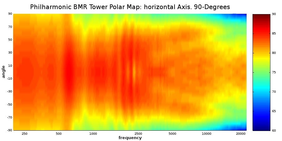 The BMR Tower can be seen maintaining a strong and even response all the way out to 70-degrees off-axis. For tonal balance, this speaker has no ‘sweet spot,’ at least on the horizontal axis. The entirety of the front area of this speaker is the sweet spot. It’s a rare speaker that would sound reasonably good at a 70-degree angle, which is almost a right angle of the BMR Tower’s forward-facing direction. Any reflected sound will have the same timbre as the direct sound, so it’s a speaker that doesn’t need any acoustic treatments to sound good. Acoustic absorbers could be used to diminish lateral reflections which might sharpen up the soundstage at the expense of spaciousness, but why buy such a wide dispersion loudspeaker and not take advantage of its unique properties to begin with?