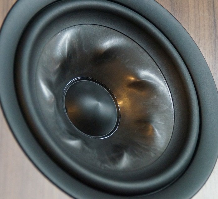 “The cone has a peculiar shape that Polk calls the ‘Turbine Cone.’ The cone shape has seven fin-type protrusions that form a vortex pattern hence the name ‘turbine.’ The shape and number of these fins are claimed to make the cone stiffer which can drive break up modes higher in frequency where they will be easier to filter out by the crossover circuit.”