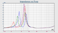 Above right is a series of impedance plots showing the effect the various port dispositions have in tuning the resonance frequency of the system. The red plot is the top port plugged, green plot is the bottom port plugged, blue is both ports open and purple is both ports plugged.