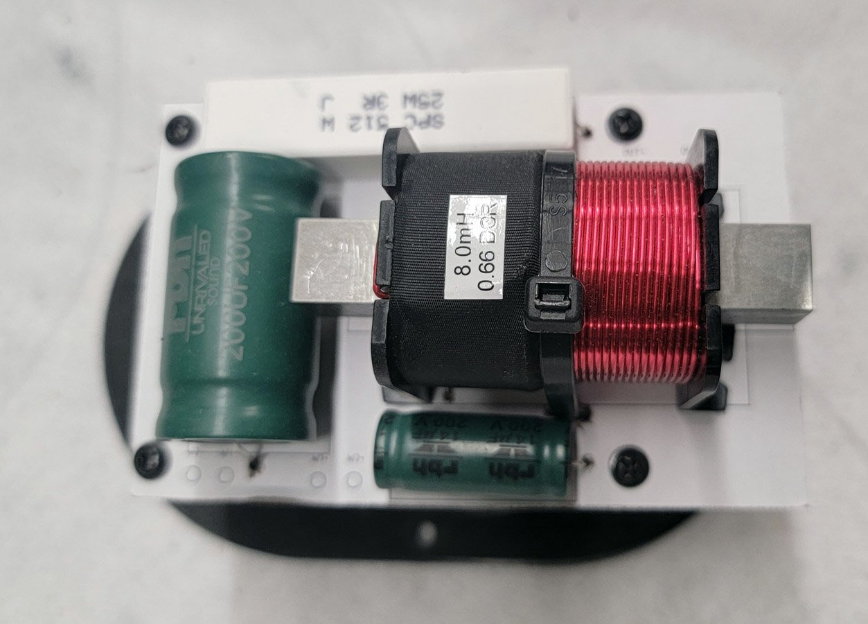 The 61-SF/R bookshelf speaker section doesn’t have a whole lot of crossover elements, but the elements it uses are high quality, with four large poly-film capacitors, two air-core inductors, and two beefy resistors. As with other RBH Sound speakers, we see the use of a self-resetting poly-switch which protects the tweeter by raising resistance above certain electrical current levels that would place the tweeter in danger.