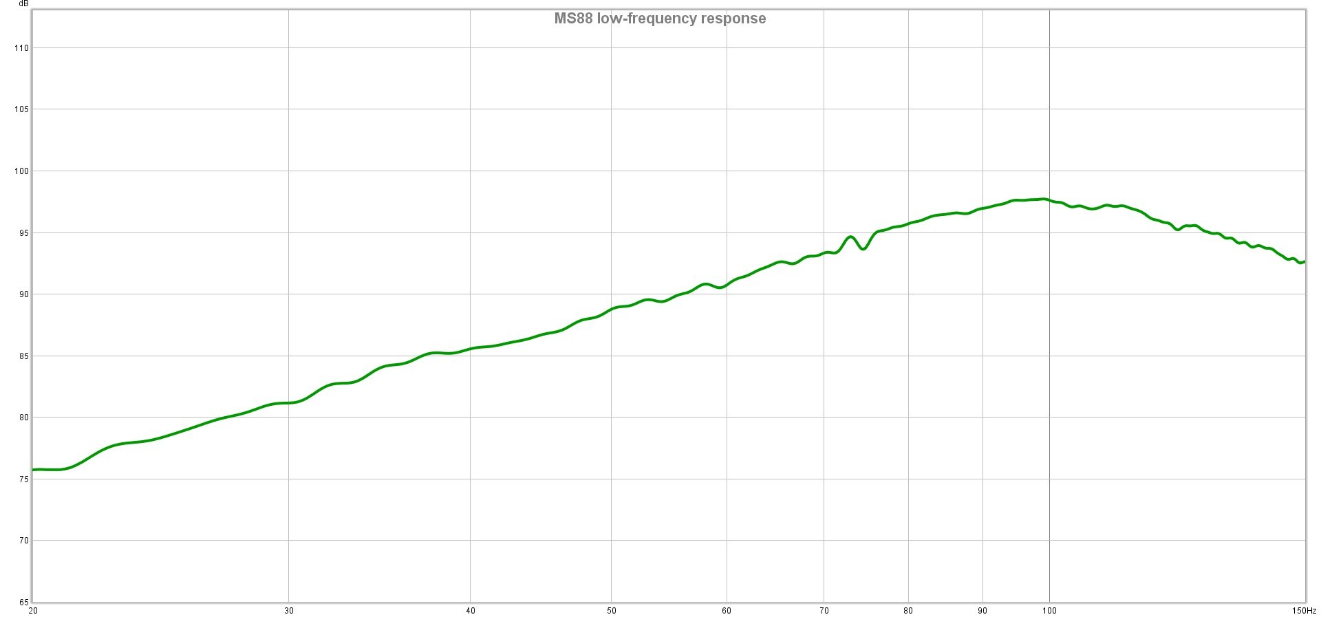 The above graphs show the 88-MS low-frequency responses that I captured using groundplane measurements (where the speaker and microphone are on the ground in a wide-open area). The MS-88 is the name of the bass module used in the 61-SFM/R. It should be noted that given the distances and crossover frequencies between the midrange driver, bass drivers, and port location, this is not an easy loudspeaker to get an accurate low-frequency response, and the port’s contribution is probably underrepresented. That being said, we can still get an idea of the extension of the 61-SFM/R. Port tuning seems to be around 30Hz; indeed, in my listening room, I could get a strong response down to 30Hz but not much below that range. The system looks to have a small bump at around 100Hz, but I didn’t notice any bass particularly thick in that range. The port is possibly a bit underdamped, but most people’s room gain will shore up lower frequencies to be on par with the mid-bass levels. This is a strategy for an even bass sound used in many floor-standing loudspeakers, and it is a sensible one. My own listening room, which does not benefit from a lot of room gain, still overboosts the bass in loudspeakers that have a flat response down to low frequencies. The bass module allows the user to change bass levels by the presence of a jumper on the positive terminals, but I found that it only changed output by about 2dB.