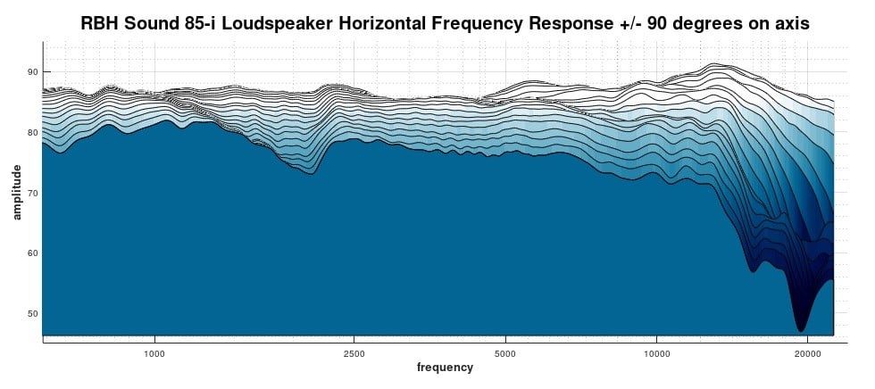 Here, we can see that the 85-i is a pretty wide dispersion loudspeaker and offers coverage over a broad area. We have at least a 50-degree angle off axis where these speakers will retain a full sound. We would have even more if we ignored that off-axis notch below 2.5kHz where the midrange integrates with the tweeter, but no one is reasonably going to be trying to listen outside a 50-degree angle, so it doesn’t matter much. The tweeter keeps a fairly wide dispersion up to a high frequency. Typical dome tweeters on a flat baffle usually have their tweeters begin constricting dispersion well below 9kHz, but the 85-i starts constricting its dispersion at around 14kHz. When it does start to beam, it does so at a rapid rate, and those who want to be met with high treble above 14kHz will want to angle the speakers to face them directly. However, without equalization, that treble will be a bit elevated.
