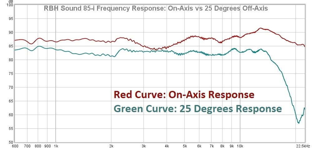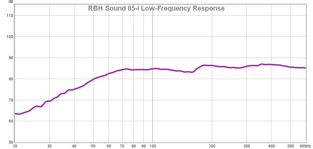 The RBH Sound 85-i was measured in free air at a height of 7.5 feet at a 1-meter distance from the microphone, and the measurements were gated at an 11-millisecond delay. In this time window, some resolution is lost below 250Hz and accuracy is completely lost below 110Hz. Measurements have been smoothed at a 1/24 octave resolution.