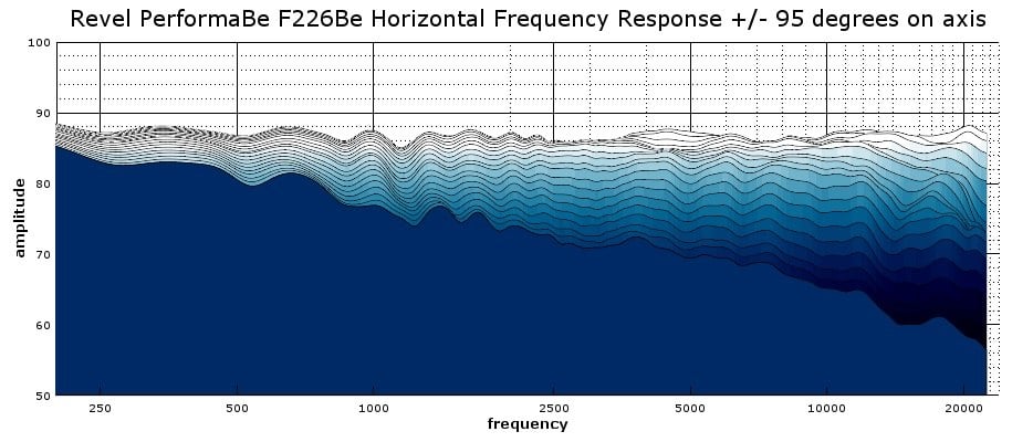 The above graphs depict the PerformaBe speakers’ direct-axis and horizontal dispersion out to a 95-degree angle in five-degree increments. Information on how to interpret these graphs can be read in our article Understanding Loudspeaker Review Measurements Part II. This is excellent performance and is something we have come to expect from Revel. Both speakers have a very flat response as well as a smooth off-axis response. Both speakers exhibit relatively wide dispersion, although, for some reason, the C426Be seems to have somewhat wider dispersion than the F226Be across the midrange and treble bands even though they use the same midrange driver and tweeter. Perhaps that is due to the much wider baffle of the C426Be as compared to the F226Be. What we can see from these graphs is that these speakers are very neutral. They produce an accurate sound over a wide angle in front of them. The listener does not have to be seated in a precise location to receive a full, balanced sound, so these speakers do not have a small ‘sweet spot.’