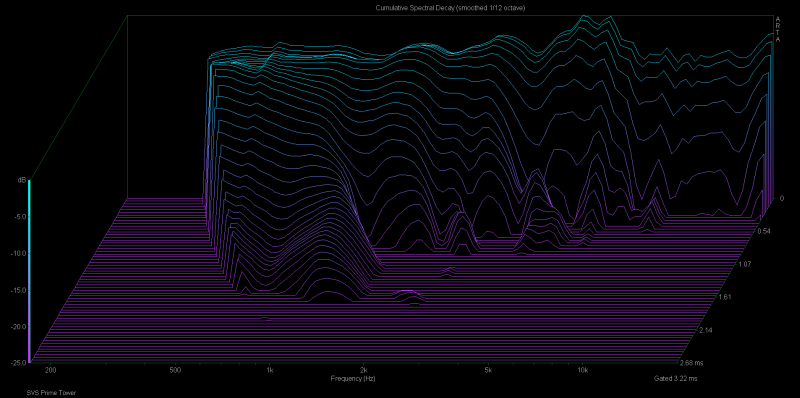 CSD, or Cumulative Spectral Decay, is a three-dimensional plot derived from the loudspeaker’s impulse response which can highlight issues. The towers exhibit an almost picture-perfect “waterfall” graph free of any ringing or other anomalies. This indicates quality driver design and selection, solid cabinet construction, and smart crossover design.